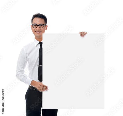 Young businessman holding blank billboard