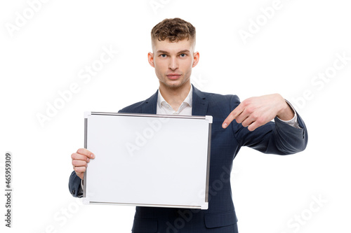 Young businessman is showing the word. Your text here