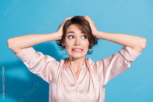 Young businesswoman in stylish pink shirt expresses funny surprise with hands on head against blue background