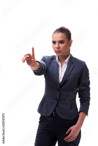 Young businesswoman pressing virtual button on white