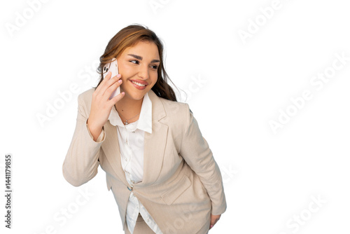 Young businesswoman smiling while speaking on smartphone, isolated on transparent background