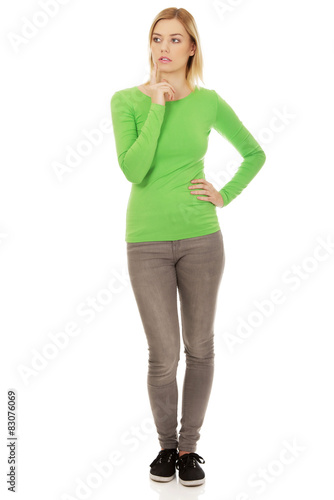 Young casual thoughtful woman.