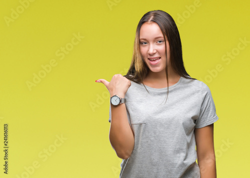 Young caucasian beautiful woman over isolated background smiling with happy face looking and pointing to the side with thumb up.