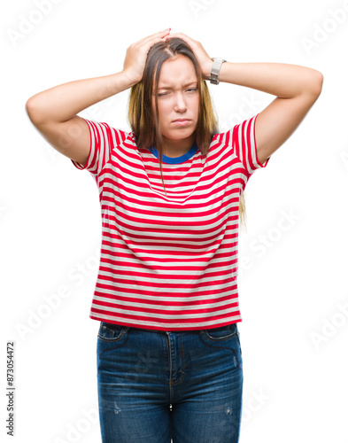 Young caucasian beautiful woman over isolated background suffering from headache desperate and stressed because pain and migraine. Hands on head.