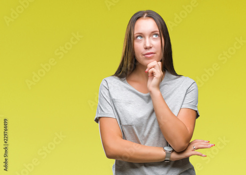 Young caucasian beautiful woman over isolated background with hand on chin thinking about question, pensive expression. Smiling with thoughtful face. Doubt concept.