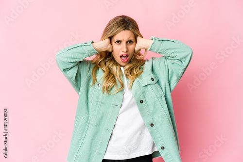 Young caucasian blonde woman covering ears with hands trying not to hear too loud sound.
