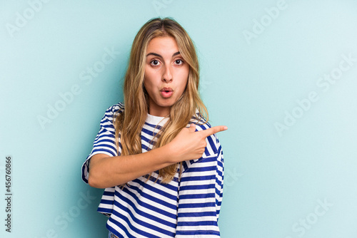 Young caucasian blonde woman isolated on blue background smiling and pointing aside, showing something at blank space.
