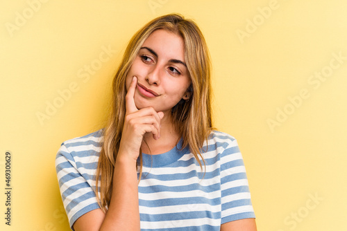 Young caucasian blonde woman isolated on yellow background contemplating, planning a strategy, thinking about the way of a business.