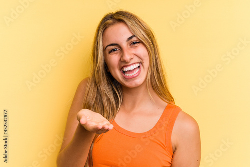 Young caucasian blonde woman isolated on yellow background stretching hand at camera in greeting gesture.