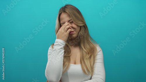 Young caucasian blonde woman pinches nose bridge under studio lights; stress headache fatigue tension.