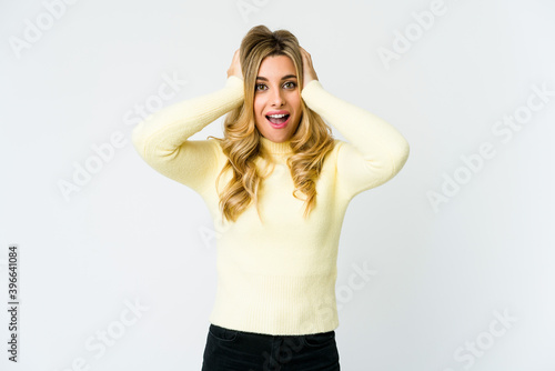 Young caucasian blonde woman screaming, very excited, passionate, satisfied with something.