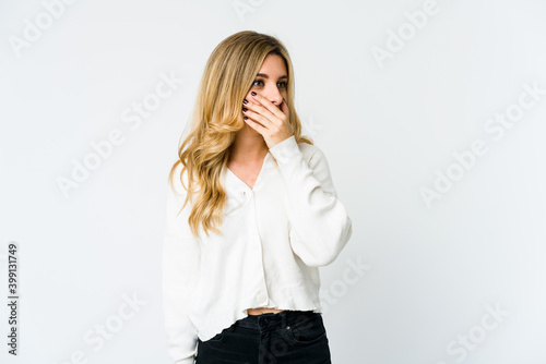 Young caucasian blonde woman thoughtful looking to a copy space covering mouth with hand.