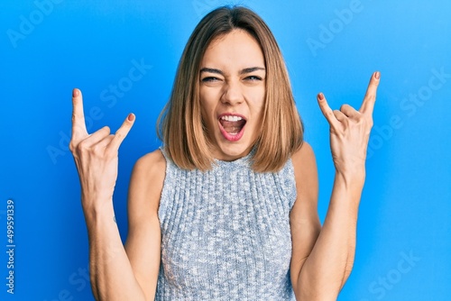 Young caucasian blonde woman wearing casual t shirt shouting with crazy expression doing rock symbol with hands up. music star. heavy concept.