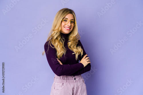 Young caucasian blonde woman who feels confident, crossing arms with determination.
