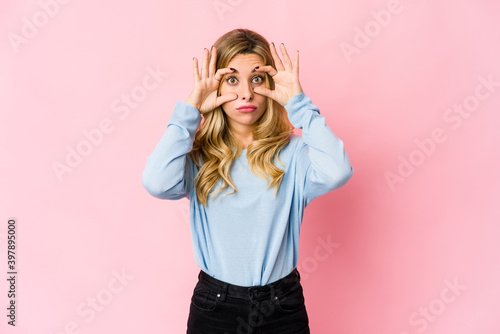 Young caucasian blonde woman who feels confident, crossing arms with determination.