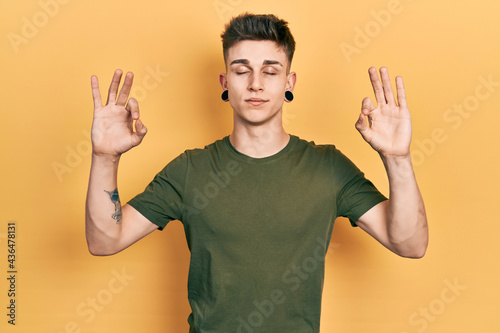 Young caucasian boy with ears dilation wearing casual green t shirt relax and smiling with eyes closed doing meditation gesture with fingers. yoga concept.