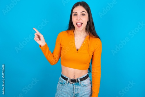 young caucasian brunette girl wearing orange crop top against blue wall points aside on copy blank space. People promotion and advertising concept
