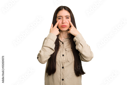 Young caucasian brunette long hair woman cutout isolated crying, unhappy with something, agony and confusion concept.