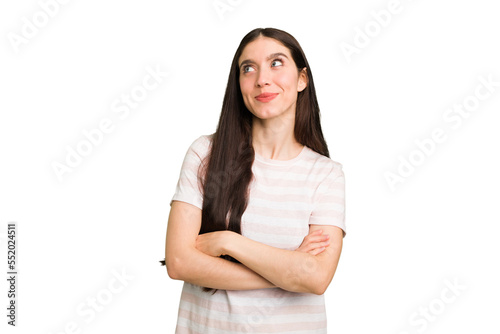 Young caucasian brunette long hair woman cutout isolated dreaming of achieving goals and purposes