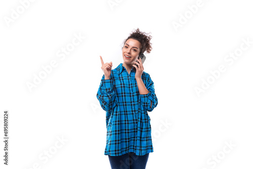 young caucasian brunette woman with hair gathered in a bun speaks on the phone