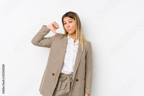 Young caucasian business woman isolated showing a dislike gesture, thumbs down. Disagreement concept.