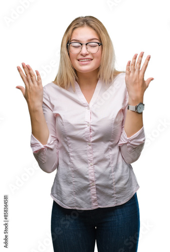 Young caucasian business woman wearing glasses over isolated background celebrating mad and crazy for success with arms raised and closed eyes screaming excited. Winner concept