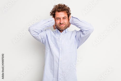 Young caucasian curly hair man isolated on white background covering ears with hands.