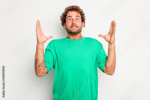 Young caucasian curly hair man isolated on white background screaming to the sky, looking up, frustrated.
