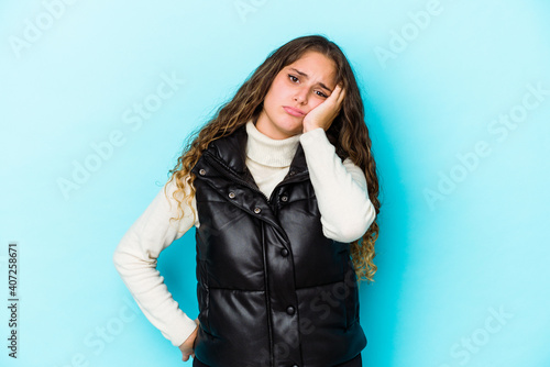 Young caucasian curly hair woman isolated tired and very sleepy keeping hand on head.