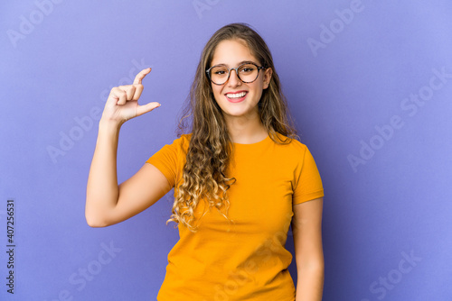 Young caucasian cute woman holding something little with forefingers, smiling and confident.