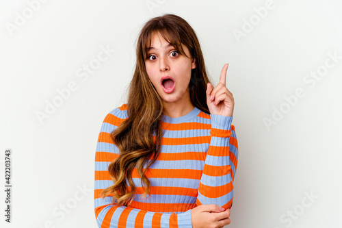 Young caucasian cute woman isolated on white background having some great idea, concept of creativity.
