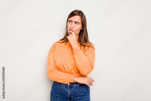 Young caucasian cute woman isolated on white background suffers pain in throat due a virus or infection.
