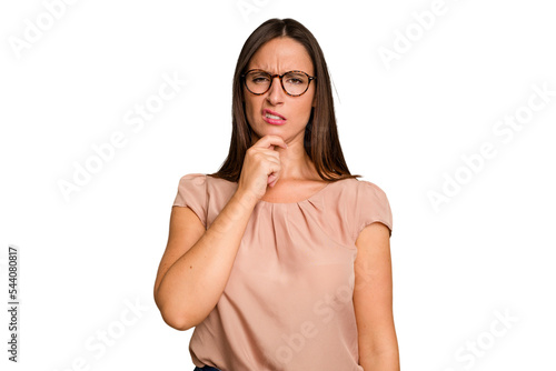 Young caucasian cute woman isolated suspicious, uncertain, examining you.
