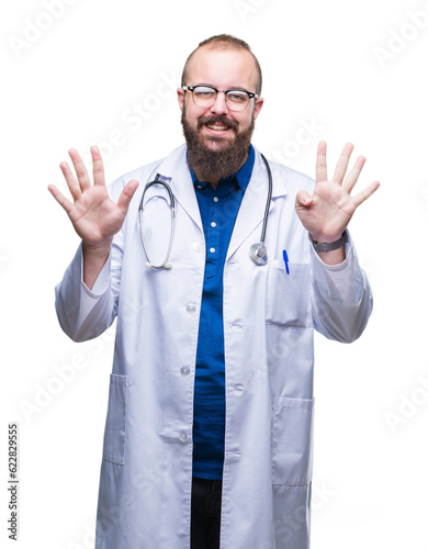 Young caucasian doctor man wearing medical white coat over isolated background showing and pointing up with fingers number nine while smiling confident and happy.