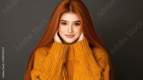 Young caucasian female in cozy yellow sweater with long red hair smiling
