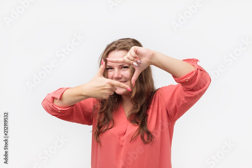 Young caucasian female in red shirt blogger plans how to shoot her new project. Study to make professional photos.