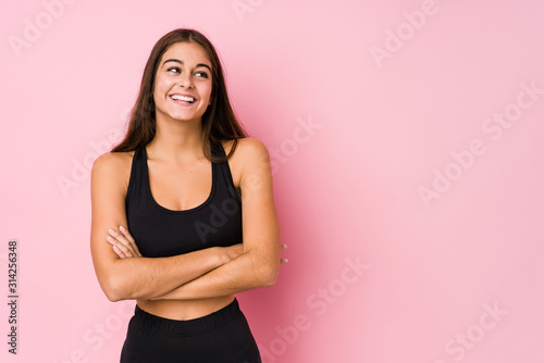 Young caucasian fitness woman doing sport isolated smiling confident with crossed arms.