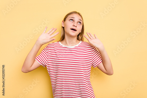 Young caucasian girl isolated on yellow background screaming to the sky, looking up, frustrated.