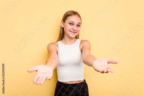 Young caucasian girl isolated on yellow background showing a welcome expression.