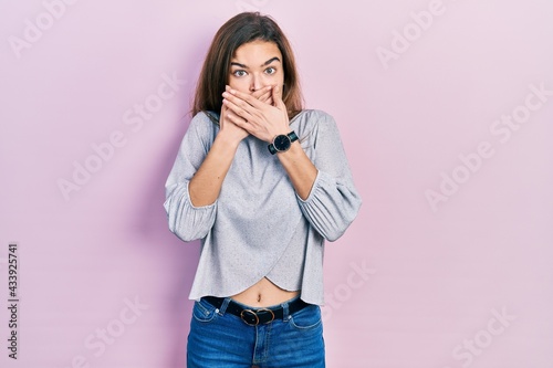 Young caucasian girl wearing casual clothes shocked covering mouth with hands for mistake. secret concept.