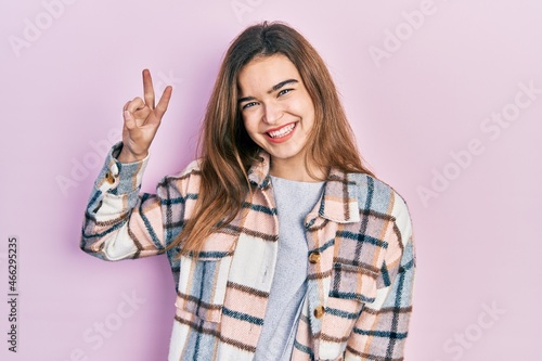 Young caucasian girl wearing casual clothes smiling looking to the camera showing fingers doing victory sign. number two.