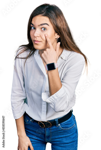 Young caucasian girl wearing casual white shirt pointing to the eye watching you gesture, suspicious expression