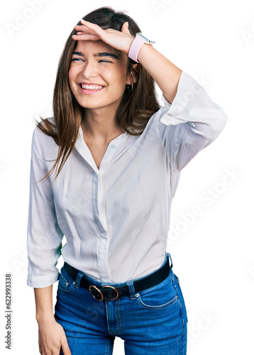 Young caucasian girl wearing casual white shirt very happy and smiling looking far away with hand over head. searching concept.
