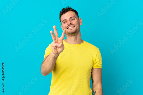 Young caucasian handsome man isolated on blue background happy and counting three with fingers