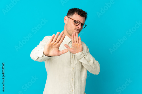 Young caucasian handsome man isolated on blue background nervous stretching hands to the front
