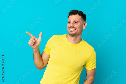 Young caucasian handsome man isolated on blue background pointing finger to the side and presenting a product