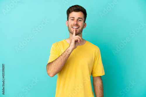 Young caucasian handsome man isolated on blue background showing a sign of silence gesture putting finger in mouth