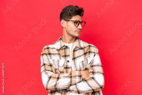 Young caucasian handsome man isolated on red background keeping the arms crossed