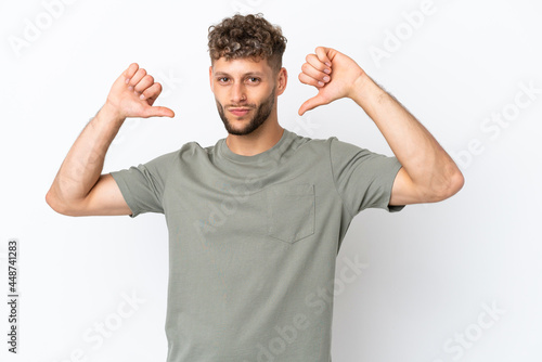 Young caucasian handsome man isolated on white background proud and self-satisfied
