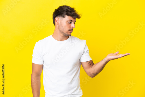 Young caucasian handsome man isolated on yellow background holding copyspace with doubts